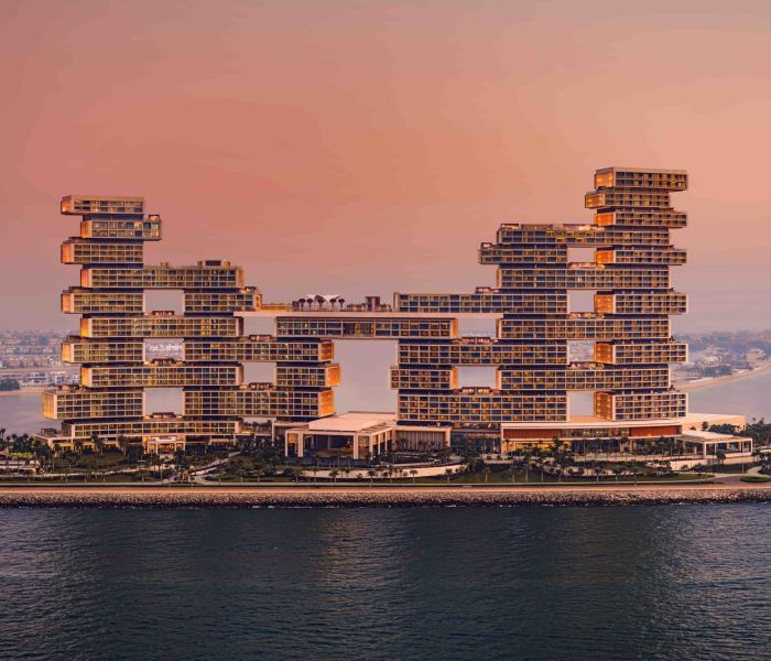 On 400 metres of private beach on the East Crescent of Palm Jumeirah – just 45 minutes from the airport and connected by an undersea tunnel.