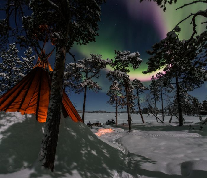 The village has snowshoes and cross country skis for guests – and a guide will take you along some of the many trails. Visit here during the summer, where the sun doesn’t set for two months and the evening skies are pink and orange. Go husky hiking, lake fishing and explore on electric fat bikes. This is Sámi country, and we highly recommend a visit to Nellim, where the various cultures come together. Then back at the village relax in an igloo sauna or a hot tub.