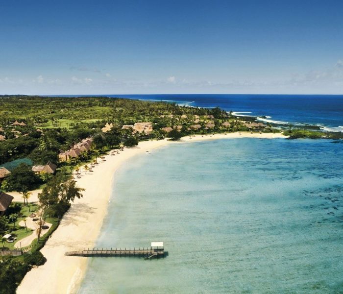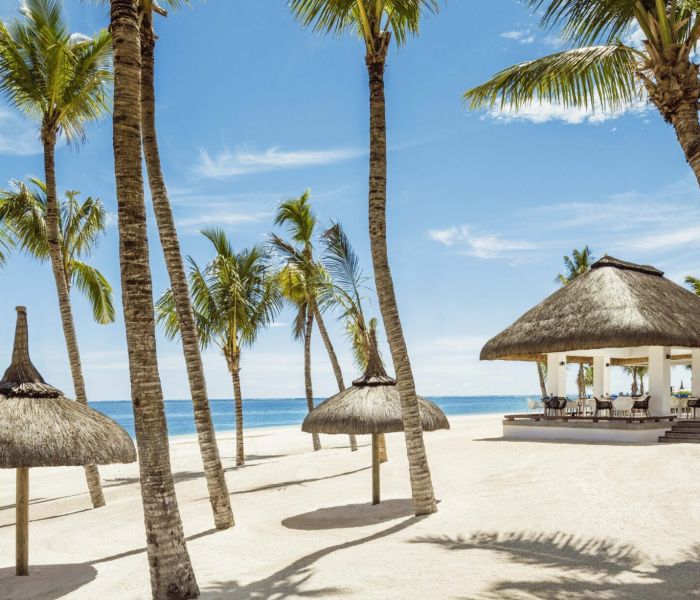 On the sugary white beach of Quatre Coco, on the east of the island. Flacq is just ten minutes away, and the airport, an hour’s drive.
