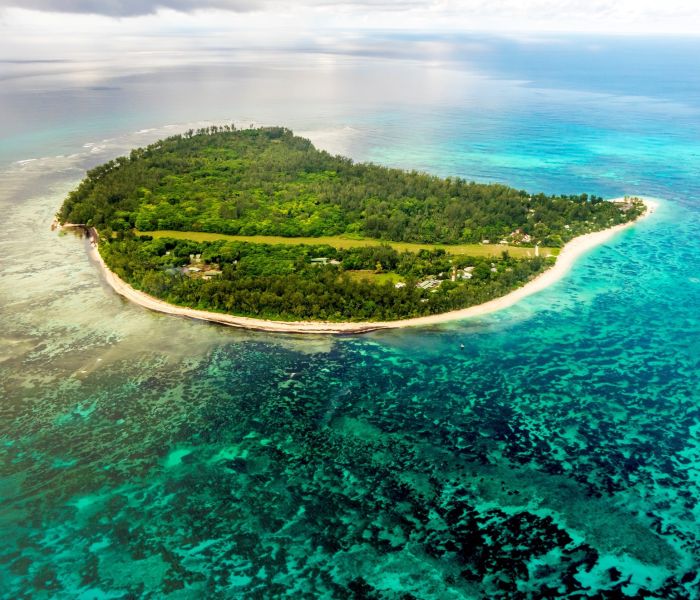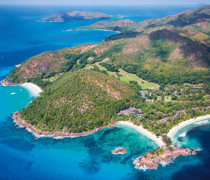 On the private island of Félicité – in the inner Granitic Islands – close to Praslin & La Digue – 90 minutes from Mahé, with a domestic flight to Praslin & followed by a boat or helicopter ride.