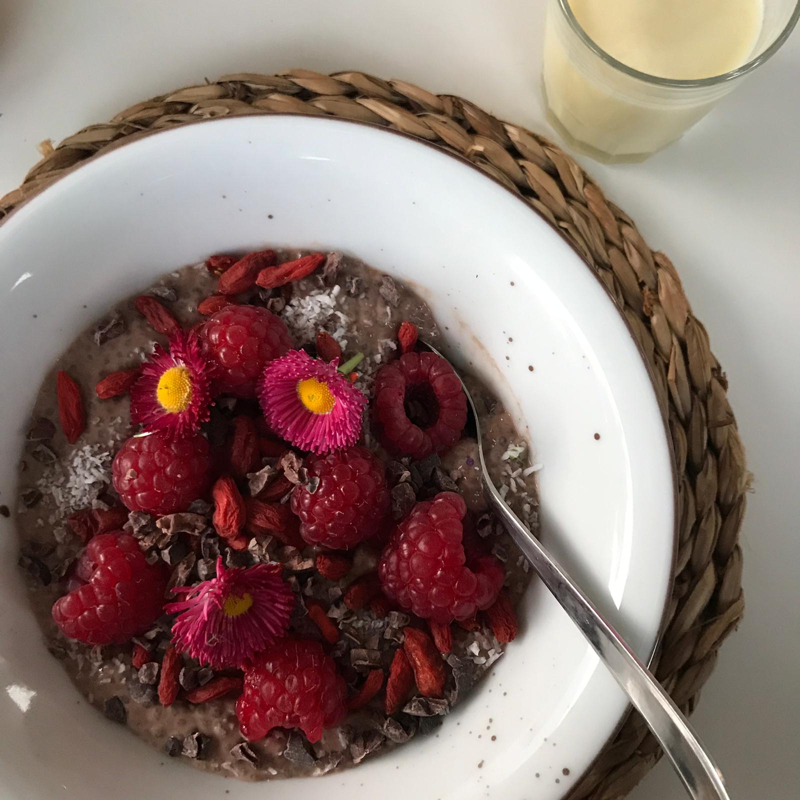 8am – Breakfast— o my god the food…all plant-based deliciousness, my idea of absolute heaven — bloating, IBS, sugar highs and lows GONE. There is the option between two portion sizes for those wanting to lose weight and those wanting to maintain. The first three days I was blumin starving — especially after certain activities such as the Breath Work Workshop (more on that later) — but weirdly I then started to lose my appetite, which is unheard of for me; the art of conversation and sitting down to eat with friends and have banter about the day became the focus; the food was just a lovely bi-product, and also a stimulus for more conversation and me asking the chef a million questions. O, please note, you ARE allowed coffee at breakfast! In fact you can have as much as you want but without sugar or cows milk; oat or soy milk only. A couple of examples of breakfast that spring to mind are the Asian flavoured tofu scramble with grilled tomatoes, kale and mushrooms or the raw cacao and coconut chia seed pudding, topped with raspberries, goji berries, desiccated coconut, and edible flowers. We would always be given a shot of smoothie or juice as well — i.e. a ginger mango or watermelon juice. A little shot is just perfect, not too many calories or sugars; but enough to satisfy the sweet tooth. I have always been a foodie and really appreciate the love and presentation that goes into every plate, so the food was an utter delight to me; we weren’t allowed phones at the table but I managed to sneak in a few photos!