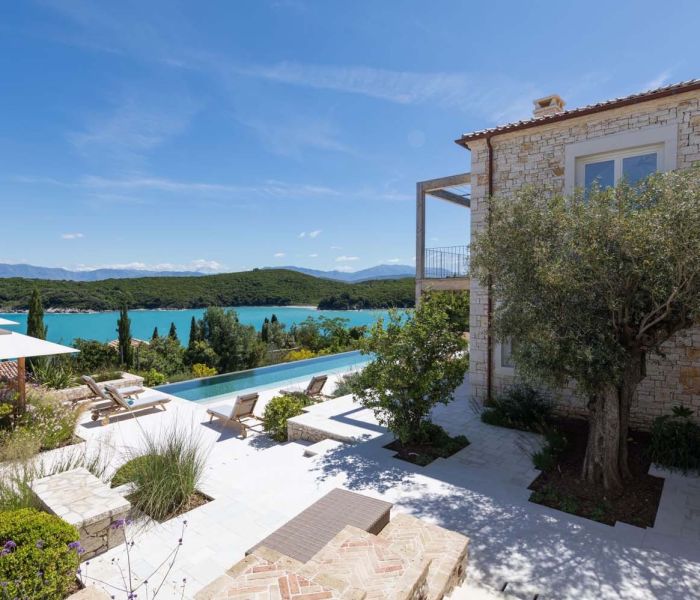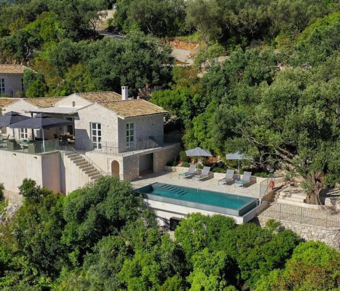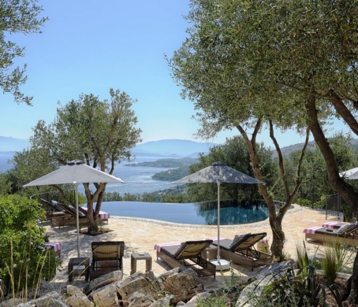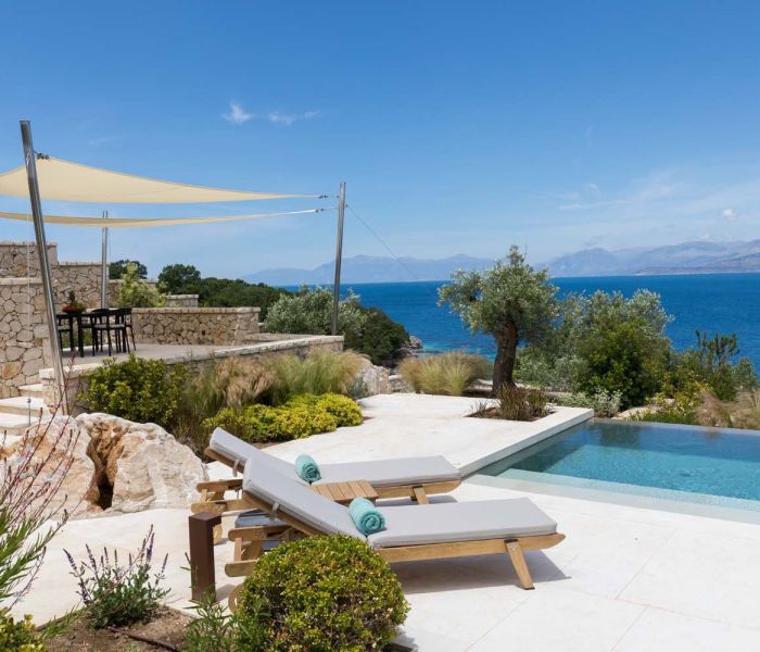 A relaxing villa, ideal for a family or group of friends, Gaia is nestled into wooded hillside in the private forty-acre Kardaki estate. We love the fabulous frontage, making the most of the simply gorgeous view of the Ionian and mainland Greece. A covered dining area and long terrace stretch the length of the villa, with further terraced areas and gardens surrounding it. It is beautifully finished inside, with high ceilings and bright, airy rooms.