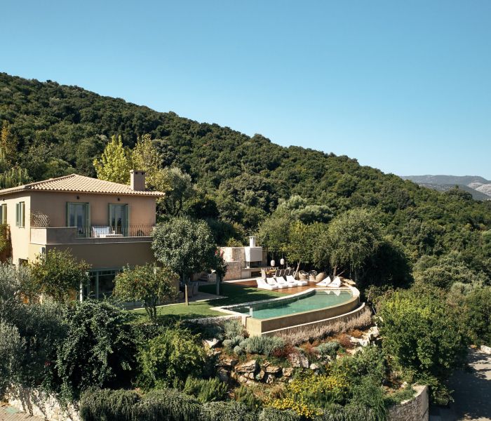On the second floor, there is another living room, with a fireplace and amazing sea views. There are also two double en-suite bedrooms on this floor as well as a third semi-double bedroom with a separate bathroom. We love that the private infinity pool is totally integrated into the natural environment, with a set of luxurious sunbeds it is the perfect spot for sunbathing and relaxation. The outside area is wonderfully tranquil and boasts a lovely pergola-shaded dining area for long alfresco lunches or dinners under the stars.